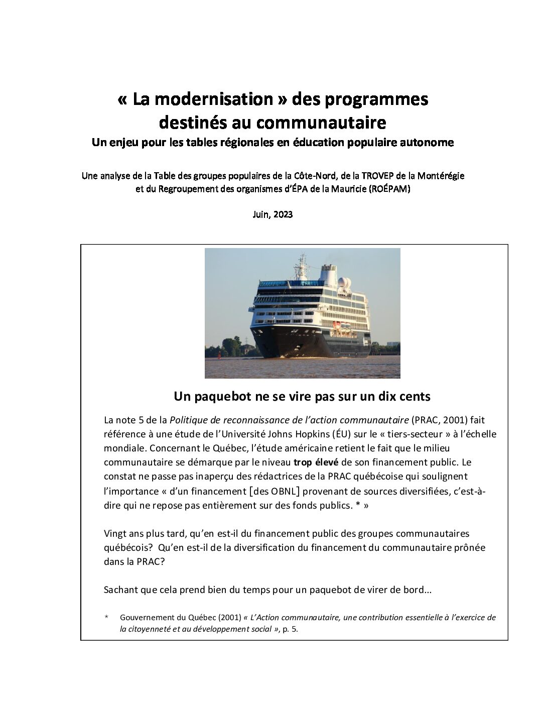 L’ensemble des démarches d’apprentissage et de réflexion critique par lesquelles des citoyens et citoyennes mènent collectivement des actions qui amènent une prise de conscience individuelle et collective au sujet de leurs conditions de vie ou de travail, et qui visent, à court, moyen ou à long terme, une transformation sociale, économique, culturelle et politique de leur milieu.